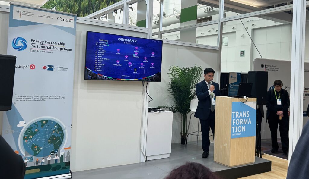 Vancouver, BC – written June 21, 2024 – To enable hydrogen and fuel cell technology providers from Germany and Canada to enjoy the UEFA Championship game between Germany and Hungary during the hy-fcell International Expo and Conference, the Consulate General of the Federal Republic of Germany in Vancouver and the Canada-Germany Energy Partnership demonstrated hospitality by inviting everyone to a reception. This event took place at the German Pavilion at 8:30 am on Wednesday, June 19, 2024, featuring beverages, finger food, and lively discussions. The UEFA EURO 2024 soccer game between Germany and Hungary was shown from 9 am to 11 am.